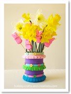 If your kids would like some easy Easter crafts to do, then this spring vase makes a great kid-friendly project. This adorable spring vase is made from craft supplies that you may already have around the house. With a little bit of felt, ribbon and some buttons, your kids can turn an ordinary tin can into a beautiful spring vase for Easter.