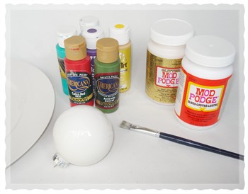 Important Note: It is important to use a glossy ornament ball because a matte ball will have no cling. It is important that your “palette” (the plate) has a glazed finish in order to give the paint the right cling. You can find a cheap glazed plate at your local dollar store. Do not use wax paper; the paint circles will have no cling. We also found that a plastic palette didn’t give the paint much cling.